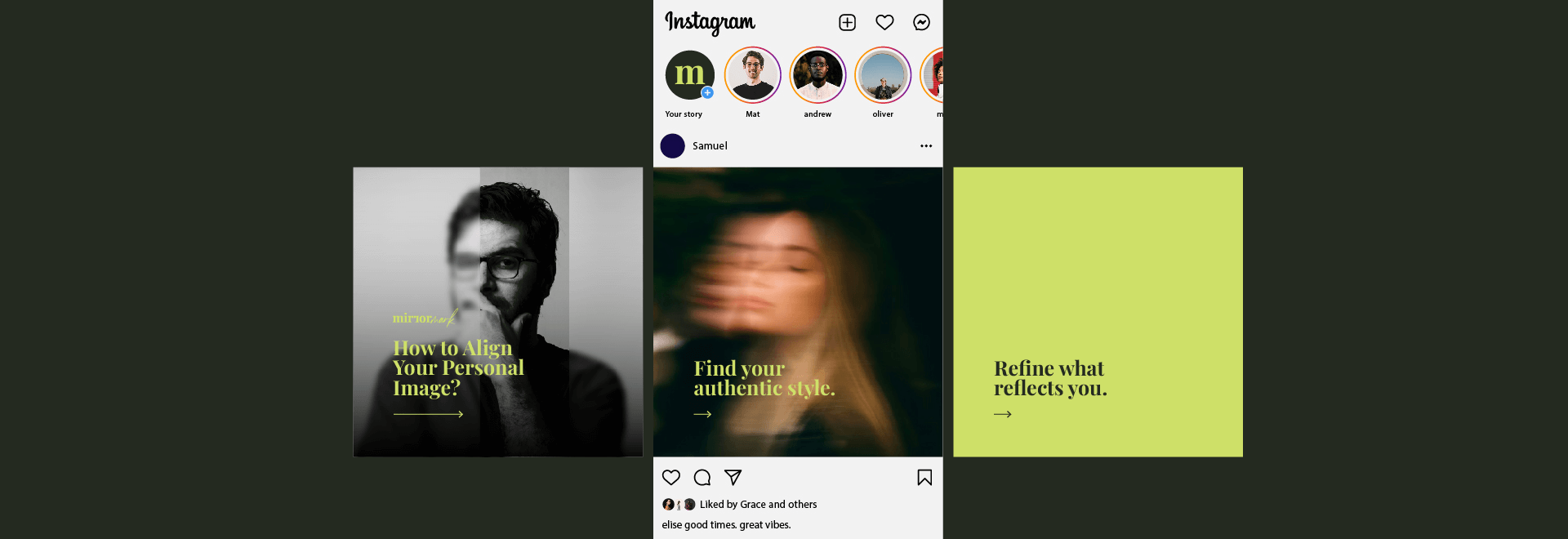 We leaned into reflective metaphors (mirrors, shadows, echoes). Content focused on archetypes, dreams, and self-reflection prompts. We built Instagram storytelling into “mirror moments” with blurred, fragmented imagery and slow, immersive captioning.